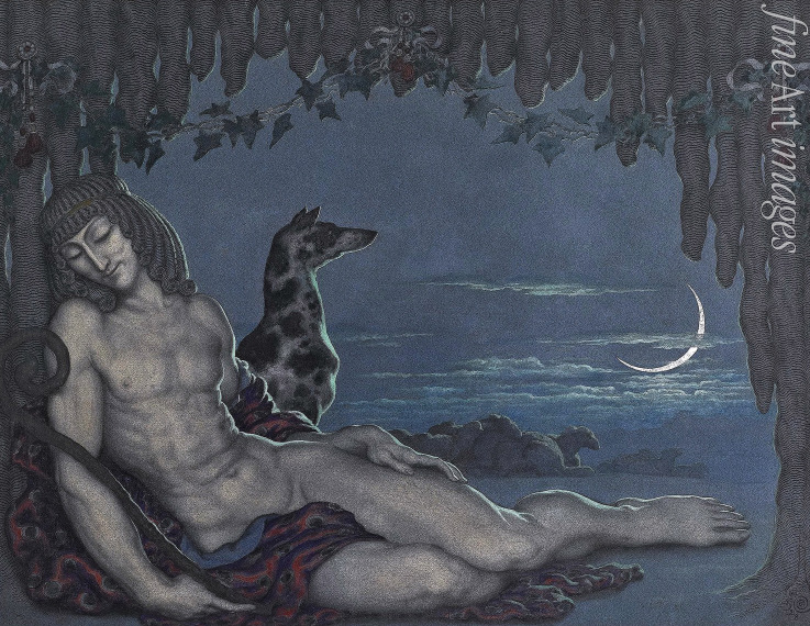 Keywords: Jugendstil, Beauty, Erotic, Diana, Godess of hunting, Mythology, Roman mythology, Greek Mythology, Ancient Rome, Ancient Greek, Godess, Endymion, King of Elis, Art nouveau, Modern Style, Modernisme, Stile Liberty, Reformstil, Wiener Secession, Stil Modern, Fin de siècle, Sleeping Endymion, Kalmakov, Kalmakoff, Artemis