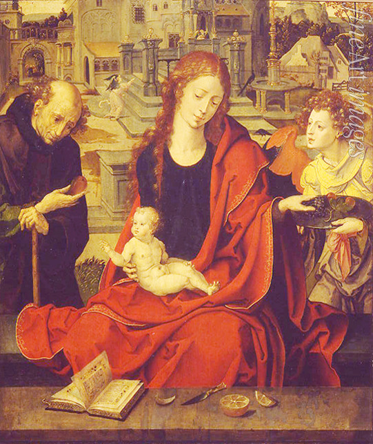 Keywords: Madonna, Bible, Renaissance, New Testament, Lemon, Maria, Virgin and child, Infant Christ, Angel, Virgin with bunch of grapes, Netherlands, The Holy Family, Book, Palace, Saint Joseph