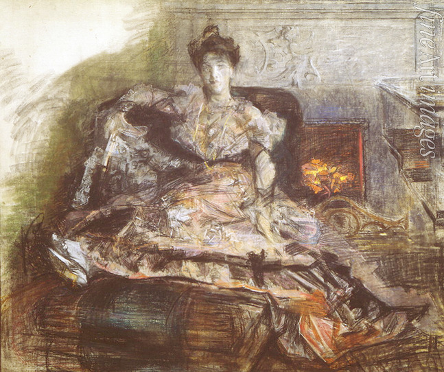 Title:After the Concert. Portrait of N. Zabela-Vrubel at the fireplace in a dress designed by Vrubel