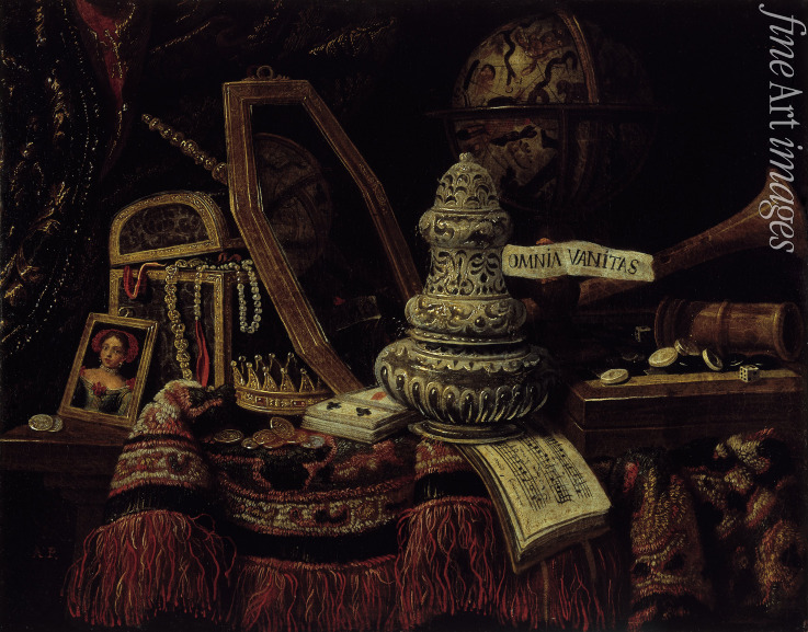 Keywords: Music instruments, Violin, Flute, Italy, Eternity, Interior, Mirror, Barock, Pipe, Books, Sheets of music, Scores, Skull, At the Table, Transience, Vanitas, Vanity, Life and Death, Memento Mori, Death symbols, Vain, Futility, Guitar, Globe, Musical instruments, Flautist, Italian Painting, Musical instrument, Flutist, Vanitas Still Life, Sheet music, Guitarist