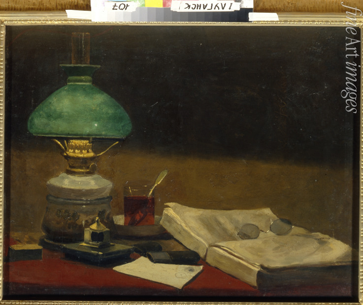 Book, At the Table, Tea, Tea set, Pot, Letter, Teacup, Tea drinking, Tea break, Writting implements, Pen, Quill, Writting pad, Writting case, Writting materials, Inkpot, Lamp, Spectacles, Glasses, Eyeglasses, Inkwell, Spectacle