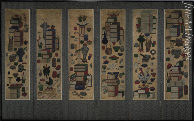 Scholar's books and utensils (Ch'aekkori). Six-section folding screen