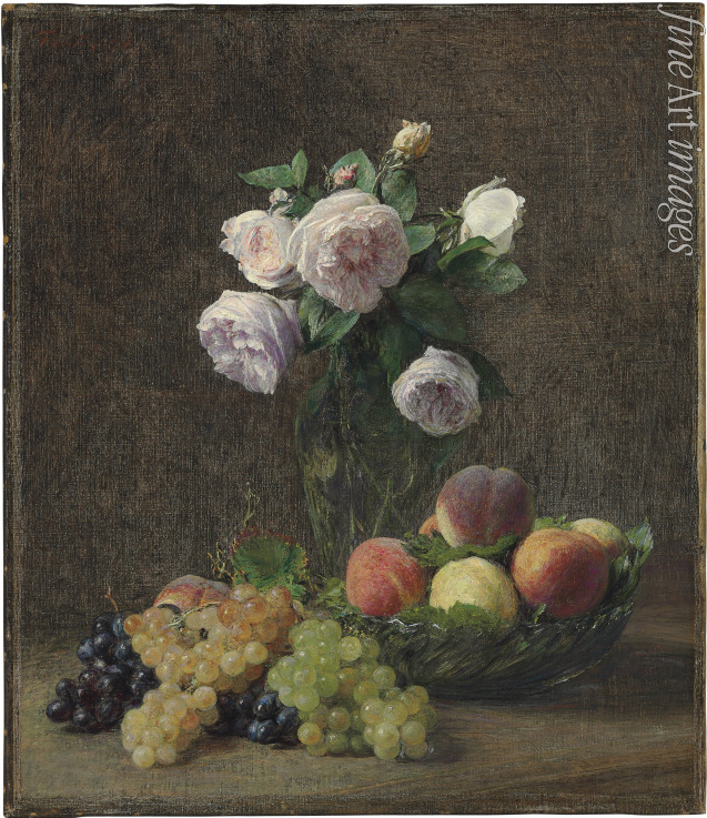 Vase de roses, pêches et raisins
