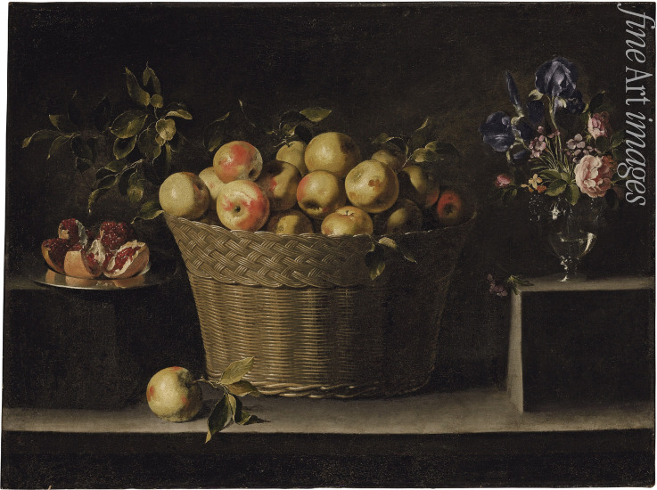 Apples in a wicker basket, an pomegranate on a silver plate and flowers in a glass vase