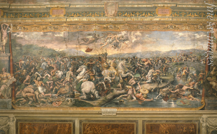 Keywords: Battle, Italian landscape, Ancient Rome, Battle on the Bridge, Marcus Aurelius Valerius Maxentius, Western Roman Emperor, Milvian Bridge, Tiber, Constantine the Great, Gaius Flavius Valerius Aurelius Constantinus, Battle of Milvian Bridge, Christianity, Emperor Maxentius, Emperor Constantine, Constantine I, Maxentius, Stanze di Raffaello, Raphael's rooms, Sala di Costantino, Hall of Constantine, Battle at Pont Milvius