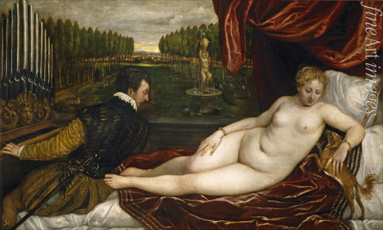 Nude, Nudity, Idyll, Beauty, Pleasure, Erotic, Renaissance, Dog, Roman mythology, Aphrodite, Ancient Rome, Godess, Goddess of Love, Lust, Roman goddess, Venus, Roman literature, Dogs, Organist, Manierism, Tizian, Organ, Pug, Fawn pug, Lapdog, Lap dog, Positive organ, Positiv organ, Positif organ, Portable organ, Chair organ