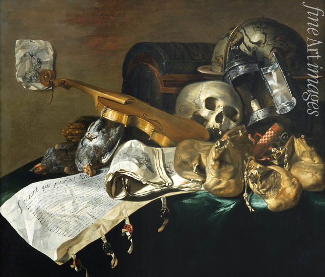 Music, Music instruments, Violin, Death, Eternity, Barock, Skull, Book, Drawing, Transience, Money, Helmet, Vanitas, Vanity, Life and Death, Memento Mori, Death symbols, Vain, Futility, Sinful, Depts, Stinginess, Musical instrument, Riche, Riches, Wealth, Opulence, Richness, Affluence, Abundance, Luxuriancy, Cornucopia, Prosperity, Wealthiness, Vanitas Still Life
