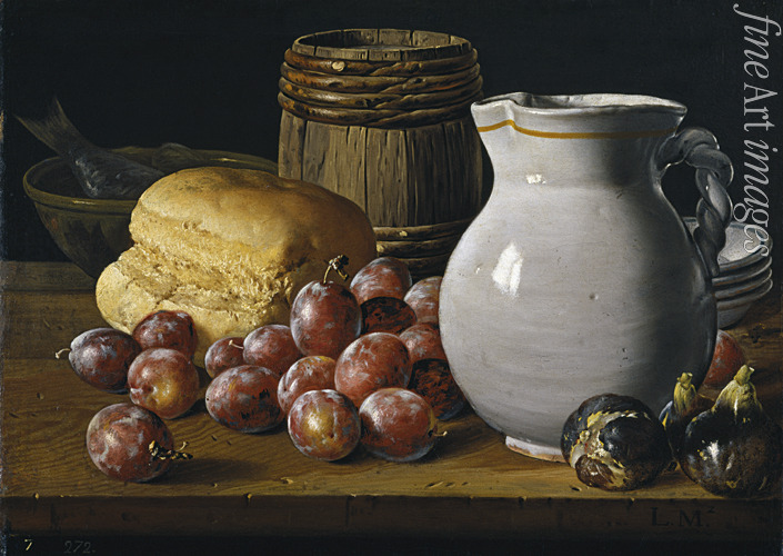 Still life with plums, figs, bread and jug