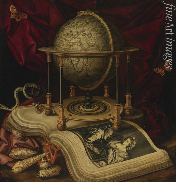 Vanitas Still Life with a Terrestrial Globe, a Book, Shells, a Snake and Butterflies