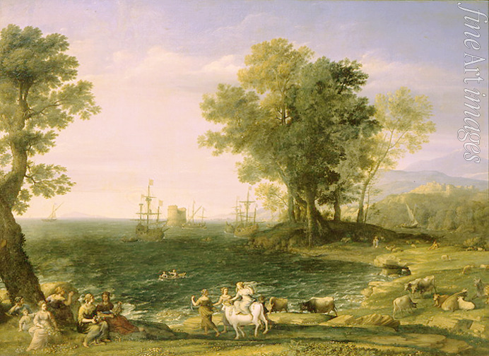 Sea, Sea landscape, Barock, Shepherds, Zeus, Greek Mythology, Coast, Rape of Europe, Bull, Kidnapping, Hermes, Herds, Ancient landscape, Ships, Goddess, Claude Gellée, Europe, Rape of Europa, Europa