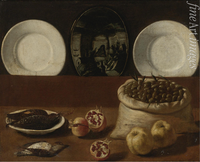 Still life with plates, a sack filled with olives, game, pomegranates, and quince
