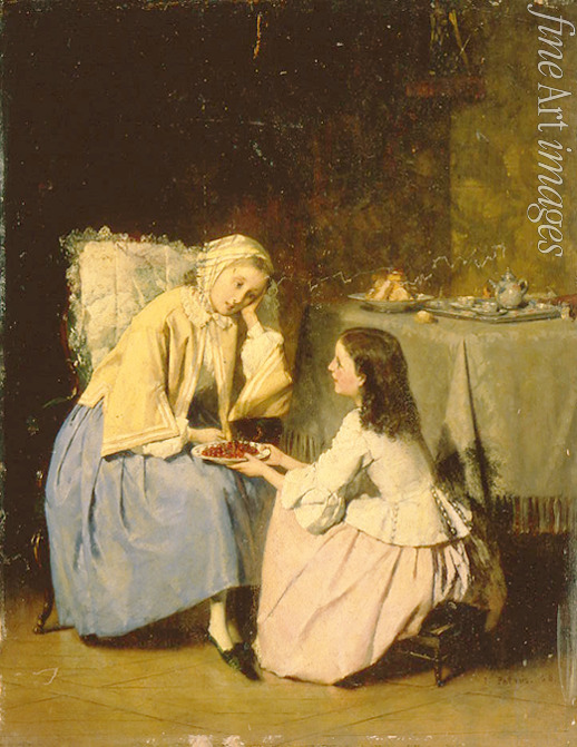 Fruit, Girls, Friendship, Youth, Covered table, Sickness, Visit, At the Table, Sick friend, Sympathy, Biscuit, Cookies, Tea, Tea set, Teapot, Berrys, Women painting, French painting, Confectionery, Tea Pot, Pastries, Konditorei, Pâtisserie