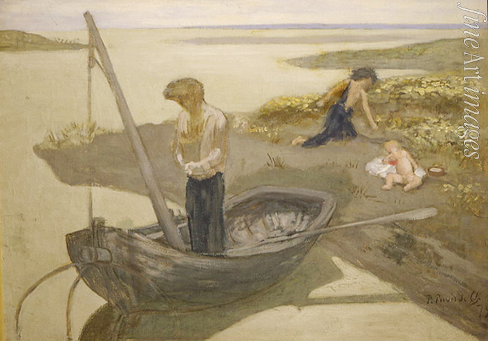 Country side, Nature, Poetry, France, Melancholy, Symbolism, Idyll, Water, Banks, Motherhood, Mother and Child, Boat, Family life, Poverty, Romantic landscape, Coast, Fisherman, Poor Family, Family scene, Poor fisherman, River landscape, Maternity