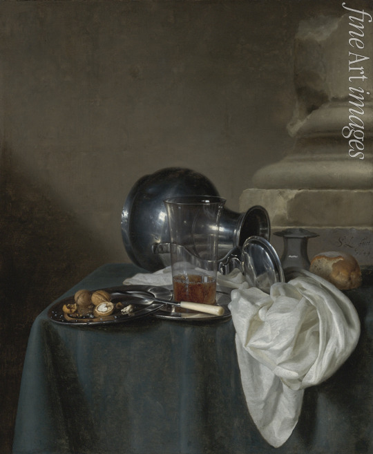 Still Life with a Pewter Jug, a glass of ale, a salt cellar and a bread roll