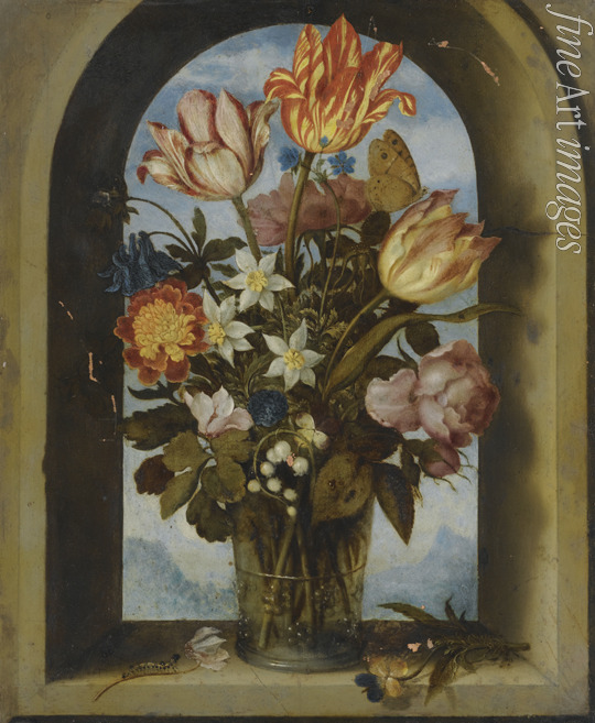 tulips, moss-roses, lily-of-the-valley and other flowers in a glass beaker set in an arched stone window opening