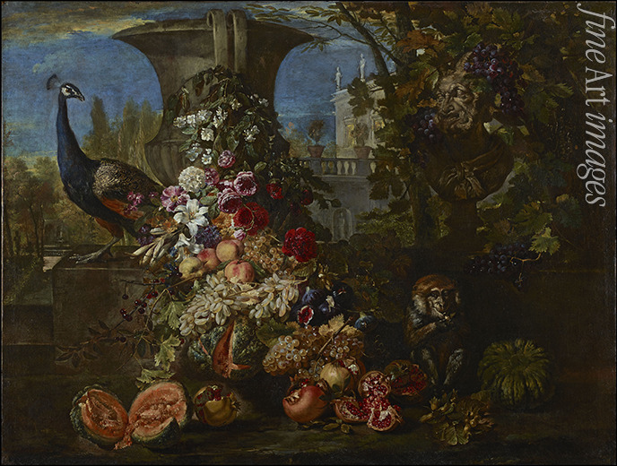Still life with fruits and flowers in the garden of an Italian villa