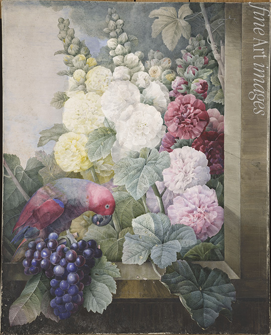 Hollyhocks, grapes and a parrot