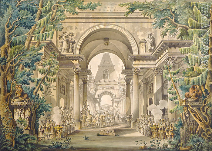 Procession in a temple. Set design for a theatre play