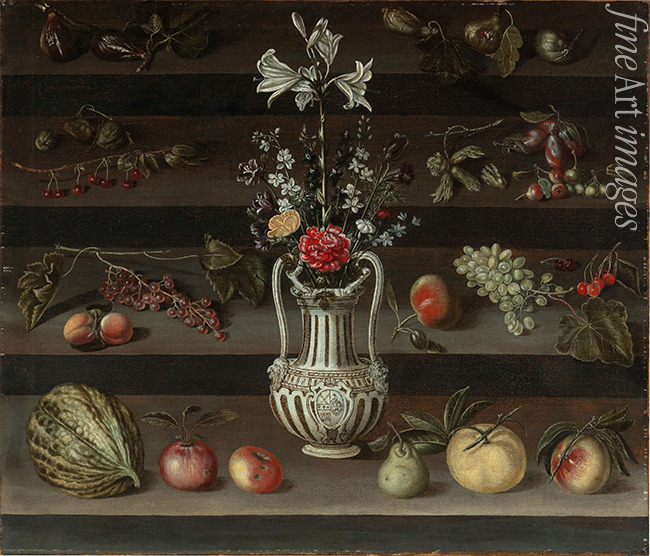 Lilies and other flowers in a majolica vase, with peaches, grapes, cherries and other fruit around, on stone steps