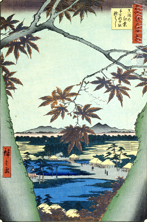Maple Leaves and the Tekona Shrine and Bridge at Mama (One Hundred Famous Views of Edo)