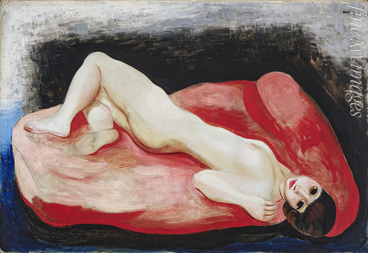 Nude lying on a red couch